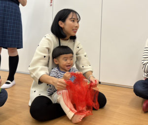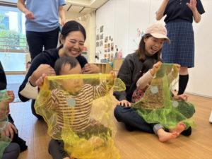 親子で“にぎり ぱっちり”や“じーじーば”のわらべ歌にのせて、布遊びを楽しみました🎵