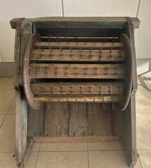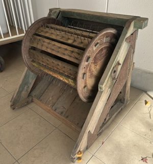 足踏み式の脱穀機を使って